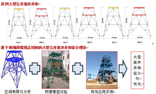 (3)解决了凿井井架特殊钢结构体系设计和稳定控制技术难题,建立了基于断绳荷载控制的凿井井架设计理论。通过模拟试验、现场实测和空间有限元分析,全面分析和评估了系列大型凿井井架的受力性能。