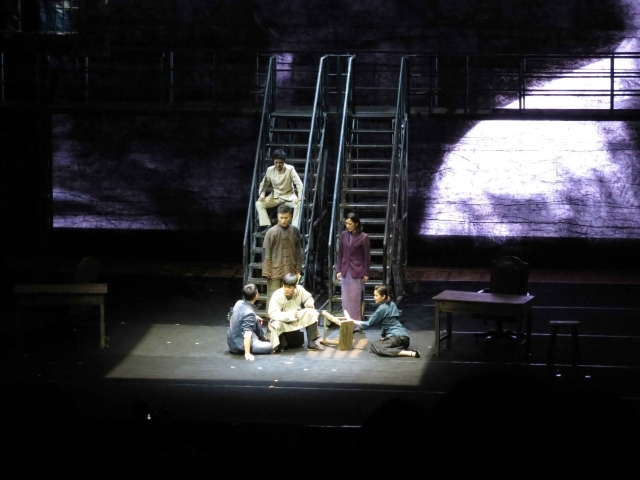 当晚七点,巡演准时开始。“雨花台”三个字映衬在黑白交错的幕布上,仿佛将人带回了那个风雨飘摇的上世纪30年代。故事发生在南京雨花台附近一座阴冷黑暗的监狱中,讲述了共产党领导人恽代英、红色特工“保尔”以及青年代表袁咨桐等人与敌人斗智斗勇、不畏严刑,最终在重要情报送出监狱后于雨花台英勇就义的感人事迹。不少同学在观看演出的过程中被革命志士与亲人告别时的依依深情与慷慨赴死时的义无反顾打动,几度哽咽,泪湿眼眶。伴随着沉重的镣铐声,雨花英烈们背对观众,大义凛然地迈向熊熊烈火,“国不可以不救,他人不去救,则唯靠我自己;他人不能救,则唯靠我自己;他人不下真心救,则唯靠我自己……”的爱国宣言久久回荡在会堂上空。雨花英烈们的坚定信仰和对新中国的美好期盼通过话剧演员们高超的表演艺术淋漓尽致地展现出来,令人折服,深深感染了台下的观众。2个小时的演出在经久不息的掌声中谢幕。