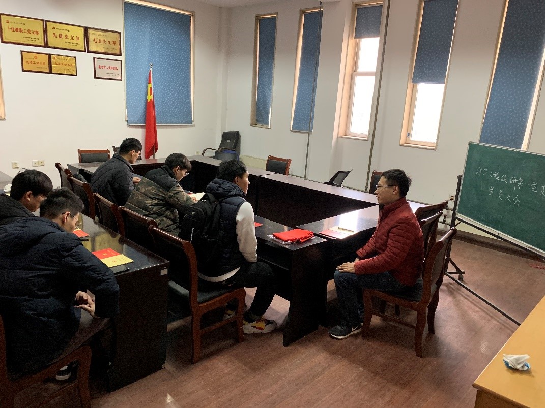 为了巩固“不忘初心、牢记使命”主题教育成果,进一步引导党员同志增强责任感和使命感,提高整体素质,发挥模范带头作用,11月25日下午,建筑工程硕研第一党支部与文昌校区建筑结构实验室会议室举行了“五个一”实践教育活动,全体党员同志参加会议。