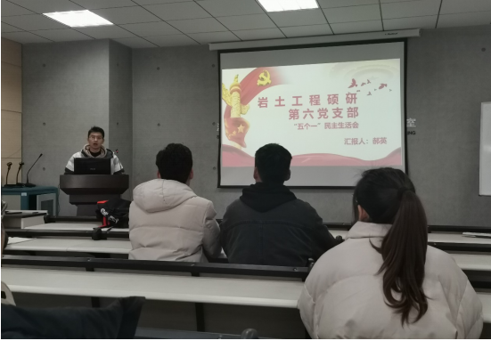 为进一步巩固深化“不忘初心、牢记使命”主题教育成果,12月5日岩土工程硕研第六党支部在深部岩土力学与地下工程国家重点实验室303开展了“五个一”教育实践活动,会议由党硕研第六党支部书记郝英主持,支部全体成员参与了本次活动。