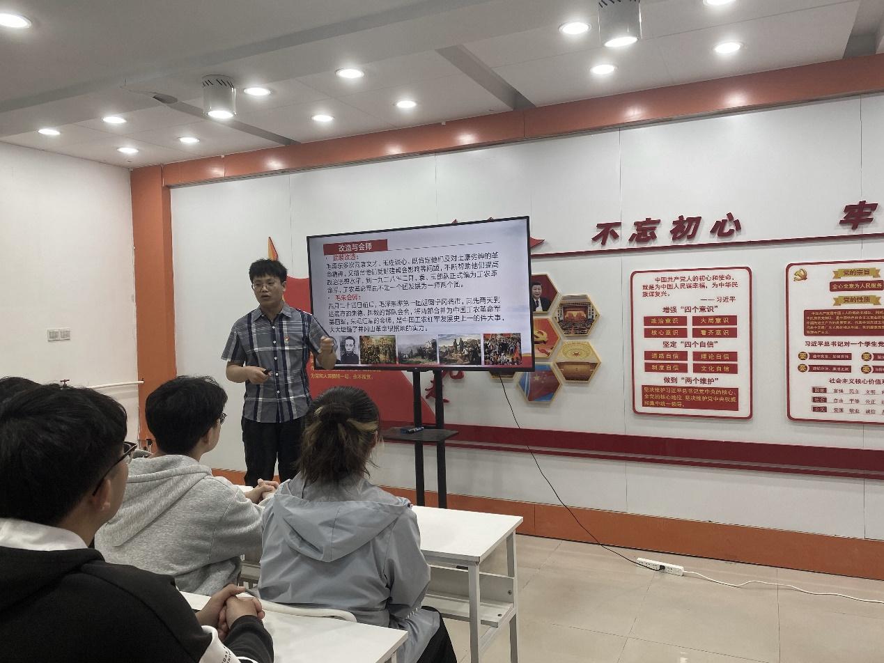 学院孙锐同学从革命失败,历史沿革,历史意义三个部分展开讲述。首先,孙锐介绍了国共合作实现后及革命爆发前夕国内的形势;其次,讲述了周边组织建立与恢复、改造与会师、二次破围等重要事件;最后他总结道,这些事件最重要的意义就是点燃了“工农武装割据”的星星之火,使中国共产党开始了从城市到农村的伟大战略转移,走上农村包围城市,武装夺取政权的新道路。