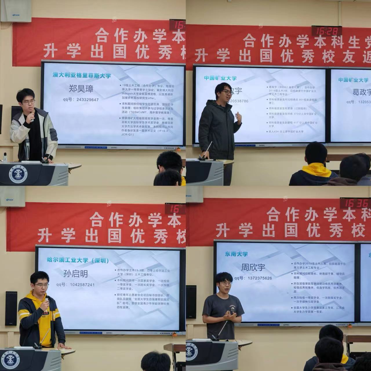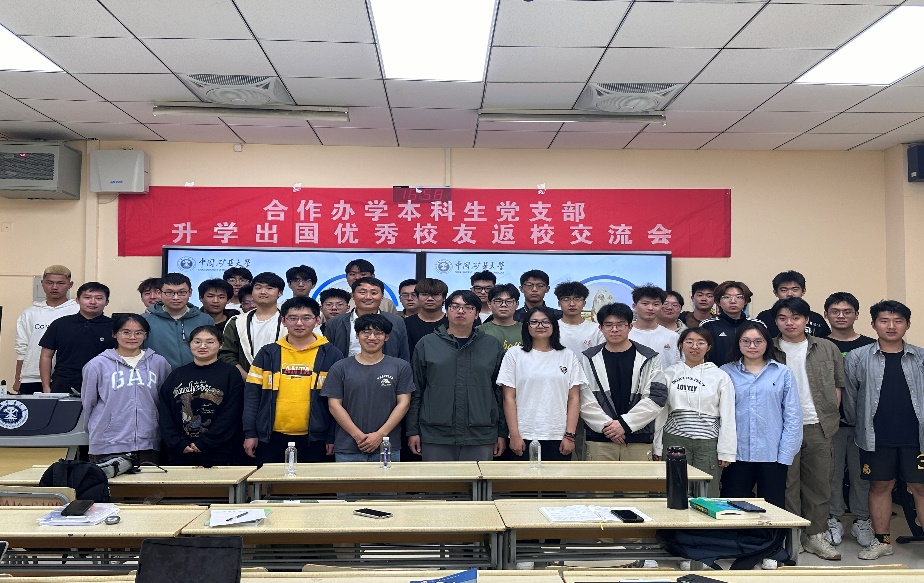 合作办学本科生党支部在博4B105开展升学出国优秀校友返校交流会。19级4位优秀毕业学子、合作办学本科生党支部全体委员及22、23级中外合作办学项目学生报名参与了本次交流会。会议由兼职辅导员郝辰翎主持。