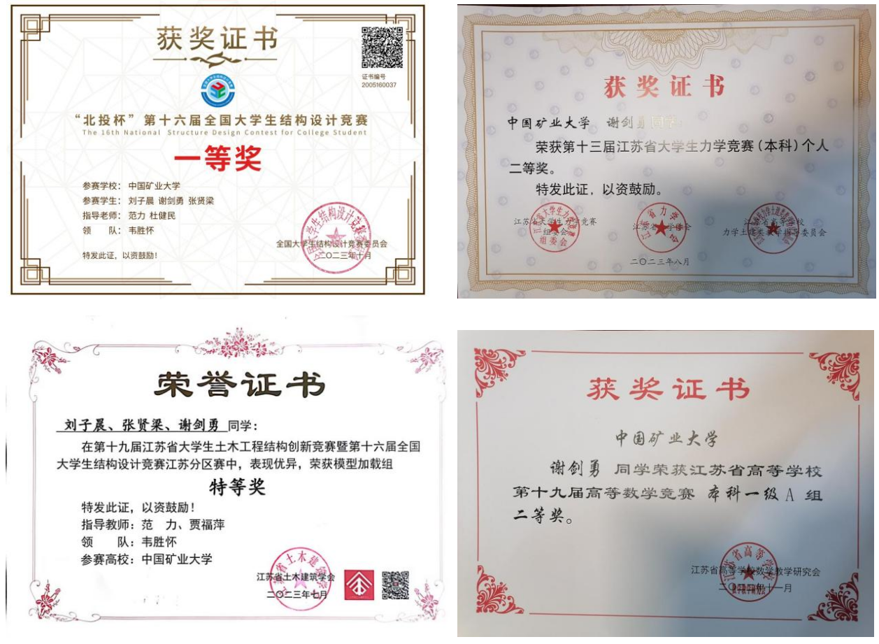 曾获2022-2023学年国家奖学金、2021-2022学年国家奖学金;曾获第十六届“北投杯”全国大学生结构设计竞赛一等奖、江苏省土木工程结构创新竞赛特等奖、江苏赛区第十五届全国大学生数学竞赛一等奖、江苏省大学生力学竞赛二等奖、江苏省第十九届高等数学竞赛二等奖等多项奖项;获评52av