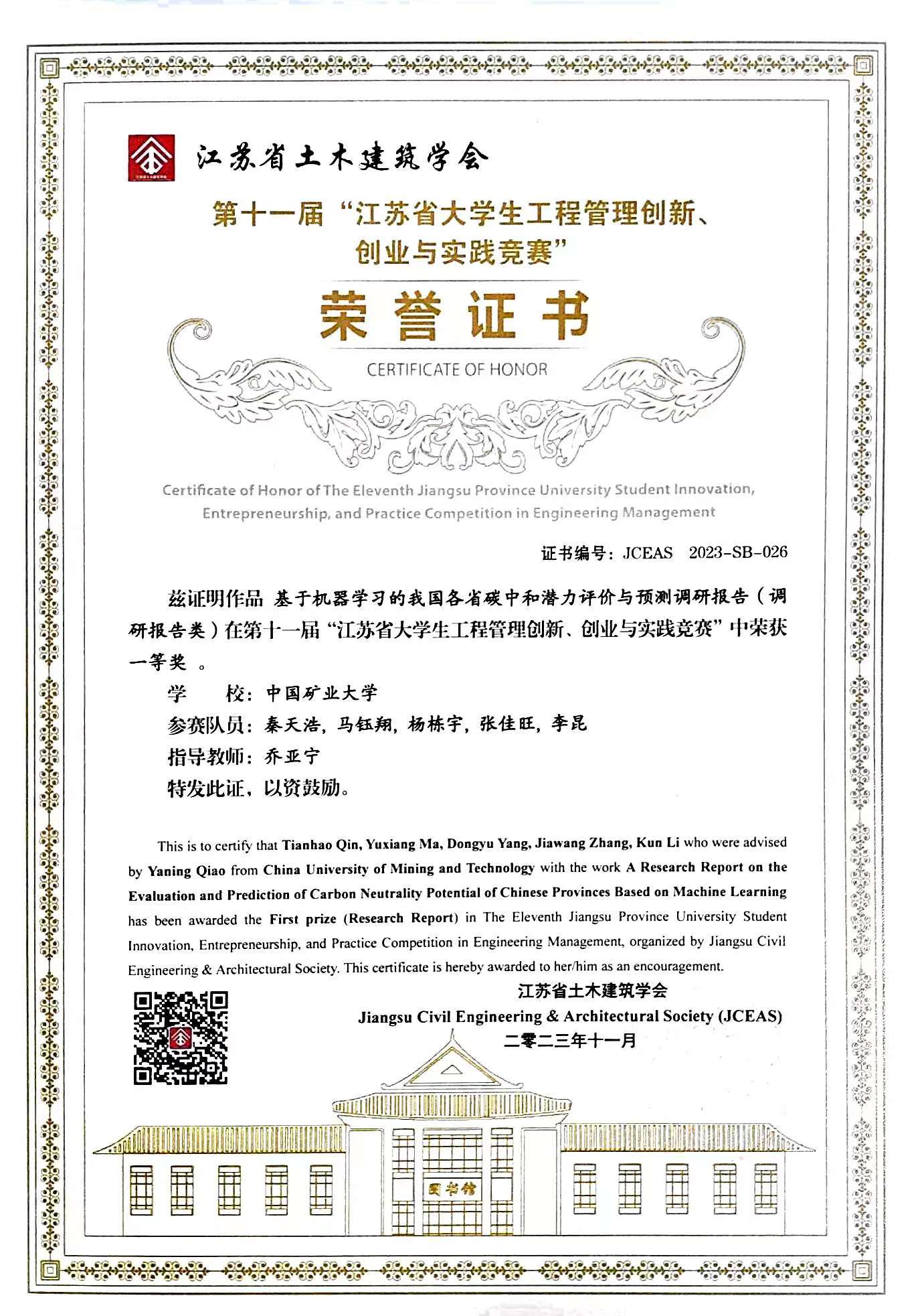 第十一届“江苏省大学生工程管理创新、创业与实践竞赛”荣誉证书