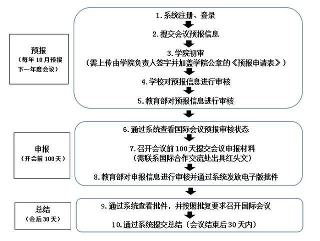 2.坚持会议预报制度。国际会议不论规模大小均应按照要求及时做好预报工作,没有预报的会议原则上教育部不再受理审批。不能出现事先对外承诺后申报的现象。