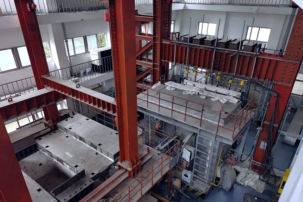 试验炉、多功能自平衡综合反力架、控制系统、燃料气化装置、安全报警系统、可视设备、电缆及管道、数据测试工作箱以及必要的连接件和附件等。其中,水平试验炉与垂直试验炉均为多用途试验炉。该试验系统可实现墙、立柱、节点、梁、楼板、单层框架等模型的足尺及缩尺模型承重及非承重耐火试验,也可用于常规试件低周往复荷载试验以及水平与垂直构件的竖向加载试验,还可在一定程度上模拟地震与火灾的耦合作用。