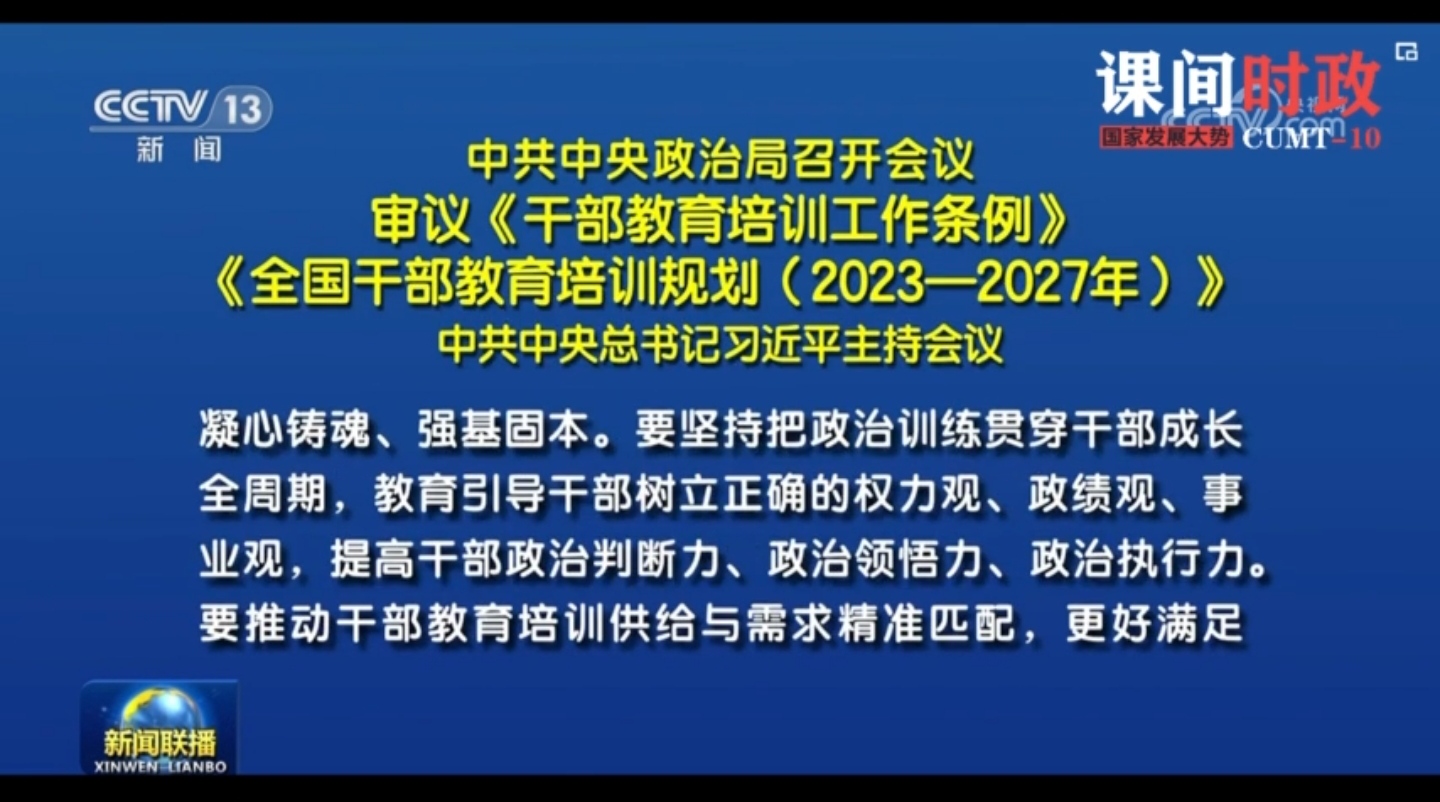 1.中共中央政治局召开会议, 审议《干部教育培训工作条例》、《全国干部教育培训规划(2023—2027年)》。 中共中央总书记习近平主持会议 。