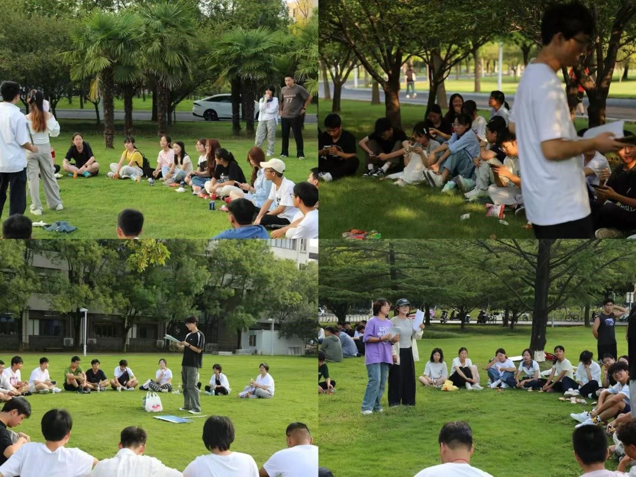各学生组织的学生干部作为活动主持人。首先进行自我介绍环节,随后同学们通过随机分组、才艺展示和击鼓传花等方式迅速打破陌生感,初步建立起团队意识。在接下来的游戏过程中大家集思广益、分工协作,充分展现了团队的智慧与凝聚力。活动接近尾声时,同学们围坐成圈,分享在拓展活动中的感悟与收获,不少新生表示,通过此次活动,不仅收获了欢乐,更感受到了集体的温暖与力量。