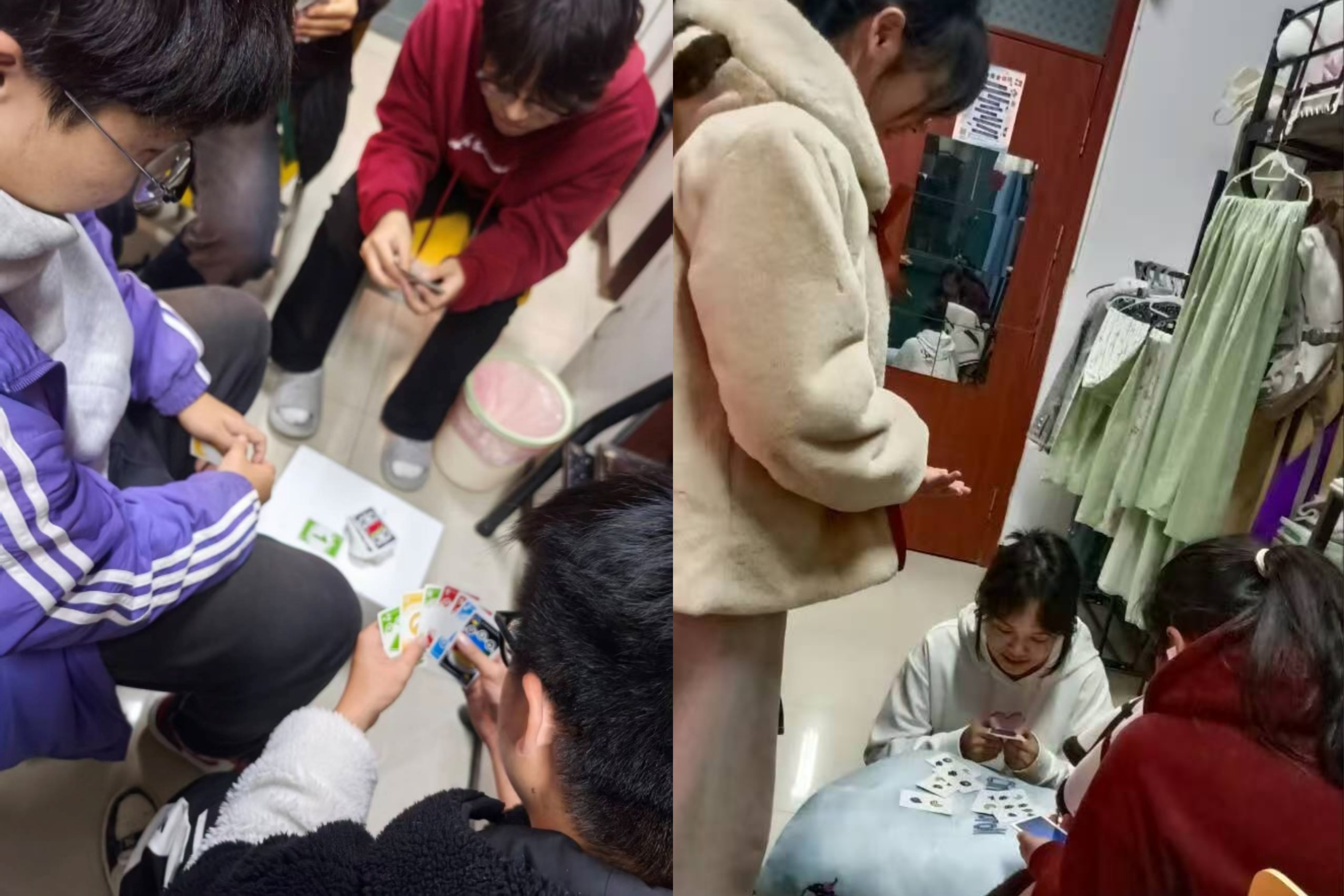 本次活动流程简洁高效,参与学生围坐于宿舍桌前,桌面整齐陈列着活动所需卡牌。经简短分工后,同学们迅速投入互动环节:部分同学手持卡牌,与邻座室友低声研讨策略;另有同学俯身桌前,凝神专注于牌面,审慎考量后续操作;亦有同学在对局失利后,以略带调侃的语气与获胜者互动,现场氛围轻松融洽。此次比赛让宿舍盈满温馨闲适,学业与实验带来的疲惫,也于这场轻松互动中悄然纾解。