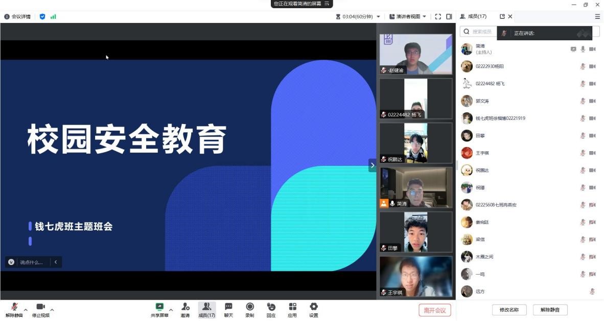 “钱七虎班”班委认真学习和贯彻习近平总书记关于安全生产的重要论述,并严格落实学校和学院关于安全工作的要求。“钱七虎班”设立有班级安全委员、宿舍长等班干部,每周日晚上会定时清查宿舍安全隐患,并检查是否有违禁物品。一旦发现安全隐患,会及时上报给学院。因此,全班同学严格遵守学校安全相关条例,从未发生过违规情况。“钱七虎班”积极组织班级同学参加学校举办的“灭火演练”、“烟雾逃生”和“安全隐患随手拍”等安全活动,在学习之余,安全委员还积极组织“钱七虎班”同学开展安全教育主题班会,以增强同学们的安全意识。因此,班内同学们具有强烈的反诈骗意识,并且从未发生过被诈骗的情况。