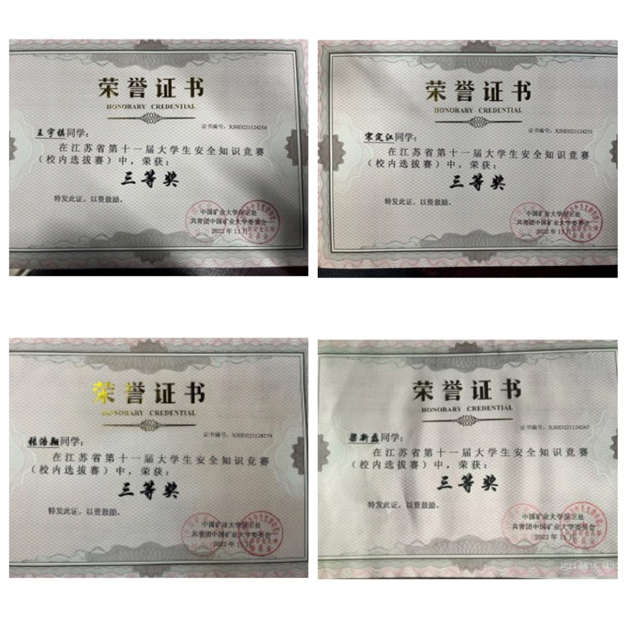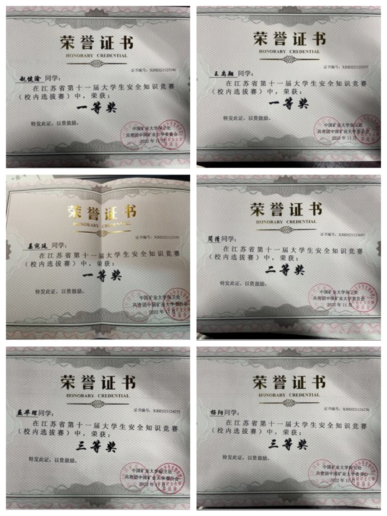 “钱七虎班”班级同学在入学前关于网上安全教育和江苏省安全知识竞赛的参与率均达到100%。其中,班级成员有3名同学获得大学生安全知识竞赛一等奖、1名同学获得大学生安全知识竞赛二等奖、6名同学获得大学生安全知识竞赛三等奖,4名同学获得52av 校园安全文化大赛二等奖。“安全示范班集体”这一荣誉的获得,离不开学院领导、班主任、辅导员和班委的认真监督,以及班级每位同学的积极配合。同时,“钱七虎班”的同学们表示,他们将继续保持对安全工作的高度重视,不断加强安全知识的学习和宣传,积极参与各项安全活动。