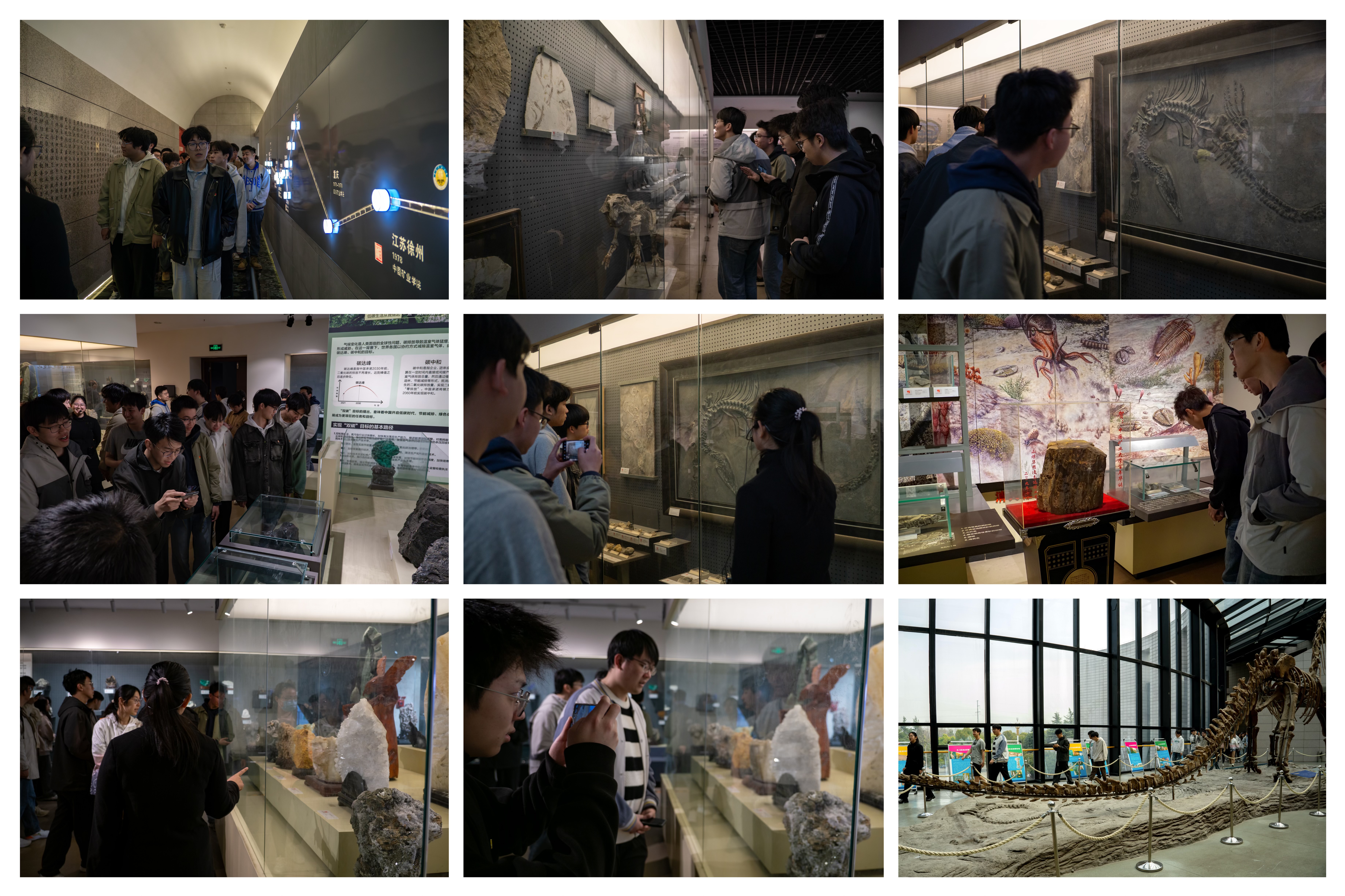 走进博物馆,同学们通过图文并茂、实物展示、数字赋能等相结合的形式,依次重点参观了设置在自然陈列馆内的“地球——我们的家园”展区、“生命起源与进化”展区、“矿物岩石与煤及其他矿产资源类”展区、精品展区、恐龙展区等五个展厅。在展厅内,同学们观摩了宇宙星空、火山喷发、板块运动、大陆漂移、矿产资源分布等多媒体互动展项模型及科普知识传播视频,参观了不同种类的古生物化石、矿物、岩石、多种煤块、腐植及其他矿产资源等各类地质标本。同学们还在精品展区观看到了形态各异、寓意丰富的灵璧石、大型石雕、玉雕、水晶洞等精美展品,并在恐龙展厅纷纷与巨大的马门溪龙骨架模型合影留恋。
