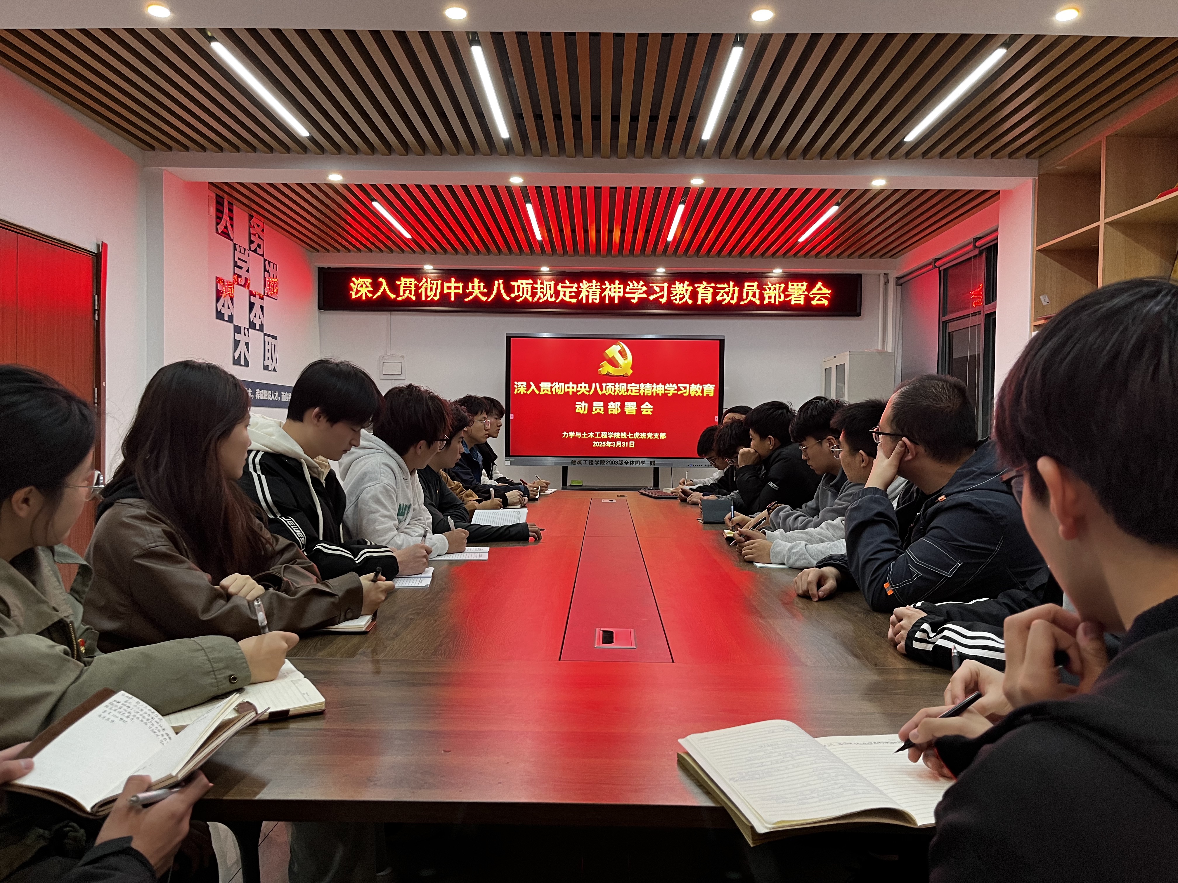 3月31日晚,钱七虎班党支部在桃苑区分党工委力土学院工作组会议室召开深入贯彻中央八项规定精神学习教育动员部署会,传达学习学校党委《关于在全校开展深入贯彻中央八项规定精神学习教育的通知(中矿委[2025]10号)》文件精神,安排部署党支部深入贯彻中央八项规定精神学习教育工作。党支部全体党员参加会议,部分入党积极分子、发展对象列席会议。