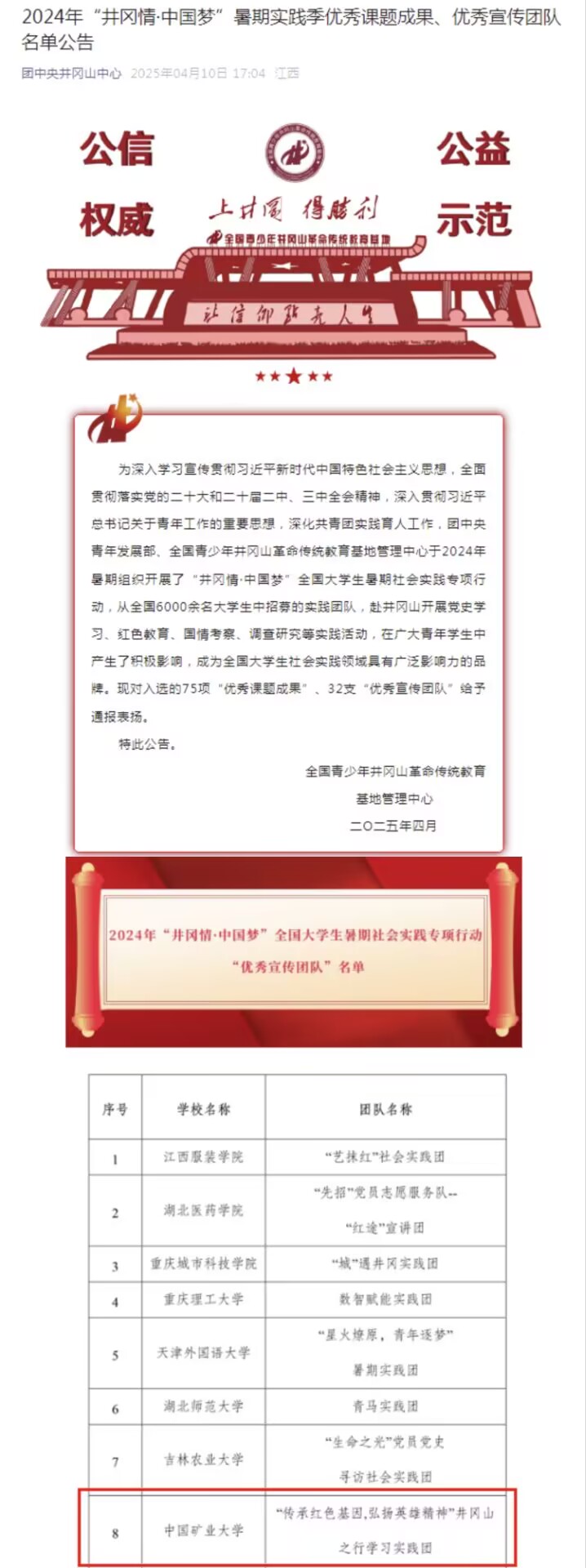 近日,在共青团中央青年发展部指导下,全国青少年井冈山革命传统教育基地管理中心发布了2024年“井冈情▪中国梦”全国大学生暑期社会实践季优秀课题成果、优秀宣传团队名单公告。52av