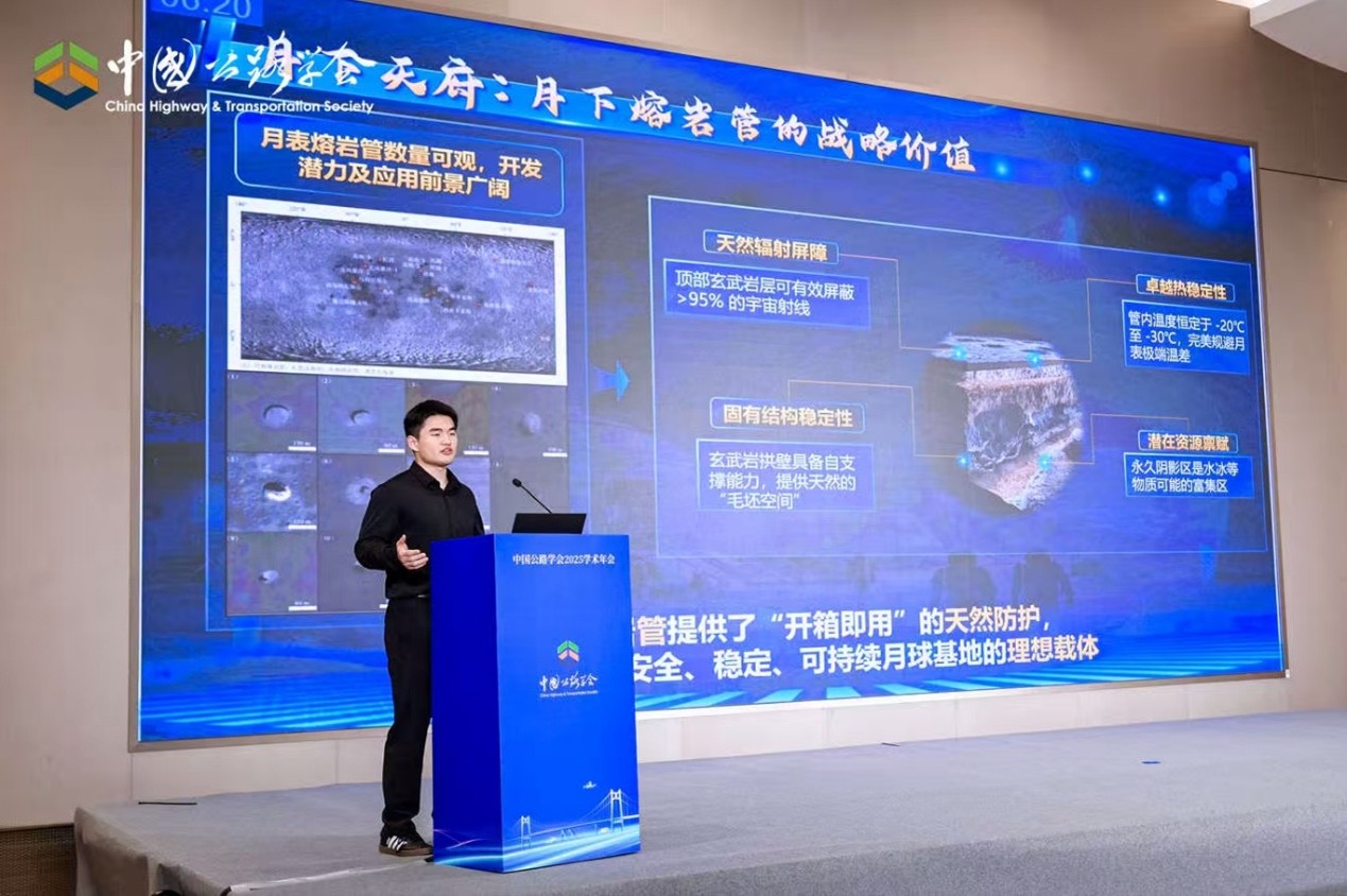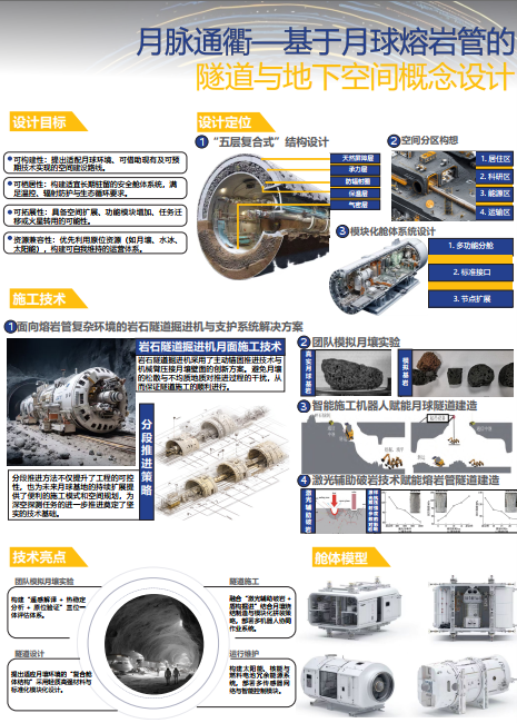 师生的参赛作品《月脉通衢——基于月球熔岩管的隧道与地下空间概念设计》精准把握“跨界融合”的大赛精神,基于团队在太空采矿、行星土力学及月表极端环境模拟等方面的研究积累,将传统隧道工程与深空探测、行星地质、原位资源利用及智能建造等多学科深度交叉。方案创新性地提出以月球熔岩管为天然载体,系统构建了包含 “五维守护”复合结构、“人机协同”智能建造和“激光辅助破岩” 等关键技术的完整工程体系,为深空探索月下空间提供了创新性解决方案。