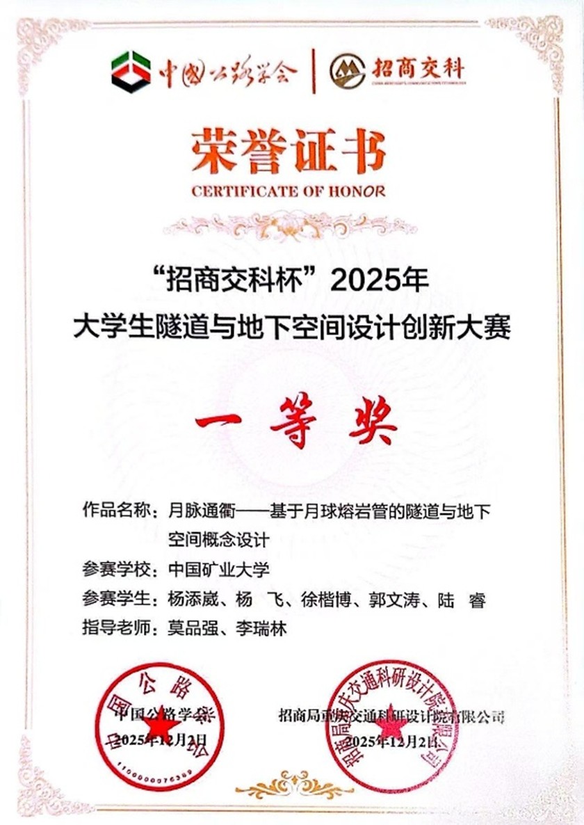 莫品强、李瑞林老师指导,杨添崴、杨飞、徐楷博、郭文涛和陆睿组成的参赛团队,凭借作品《月脉通衢——基于月球熔岩管的隧道与地下空间概念设计》,荣获全国一等奖。